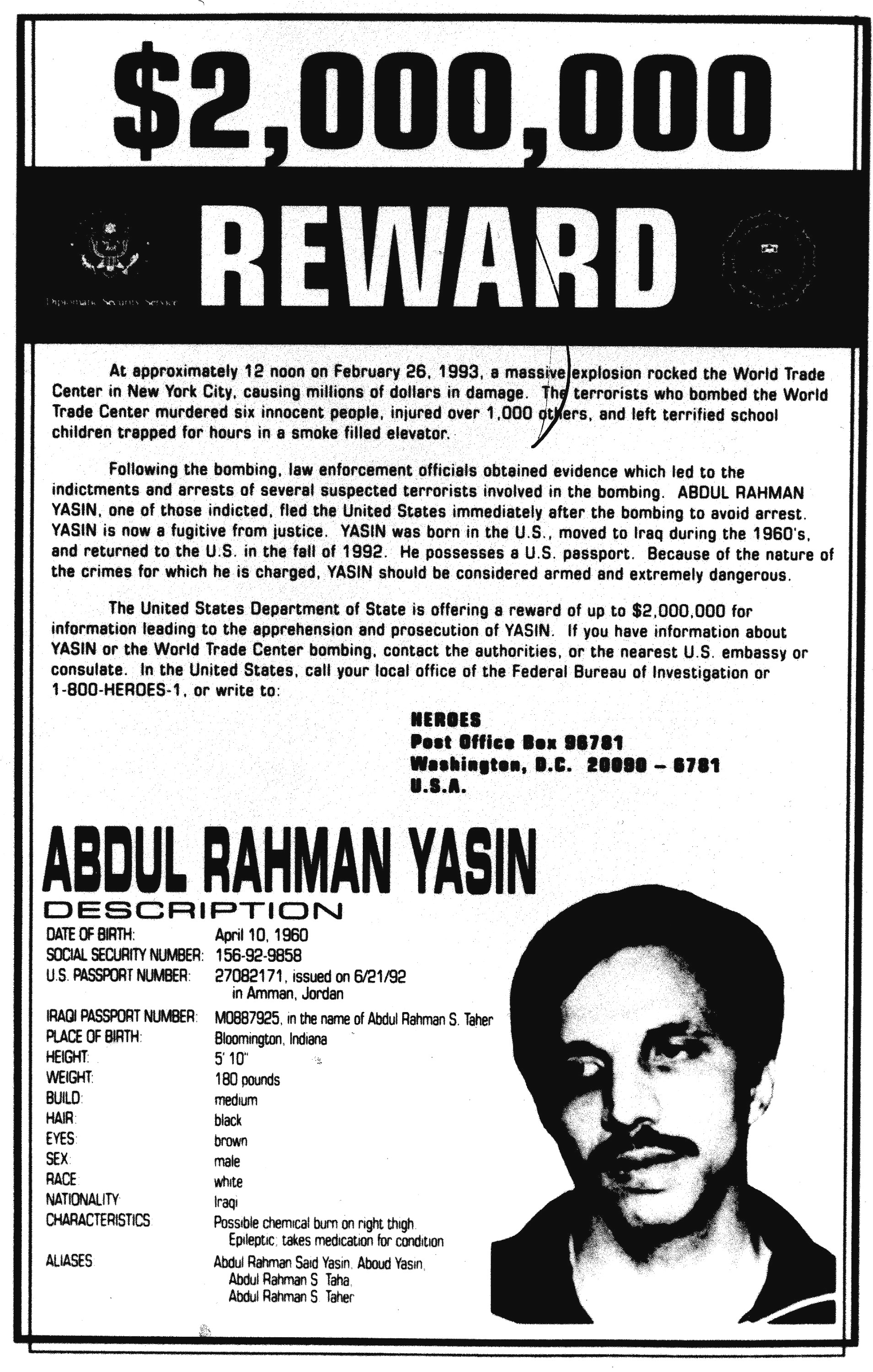 Salameh was the first of the group to be arrested, when, lacking the money for a plane ticket out of New York, he attempted to reclaim the deposit on the rental van he had just blown up. (The two suspects who successfully fled the U.S. were the two with Iraqi connections -- mastermind Ramzi Yousef and Abdul Rahman Yasin.) Salameh's NY apartment was the center of the conspiracy operation, beginning in the spring of 1992--almost a year before the bombing took place.