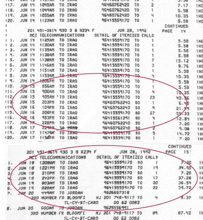 Detail of June 1992 phone log showing some of Salameh's calls to Iraq